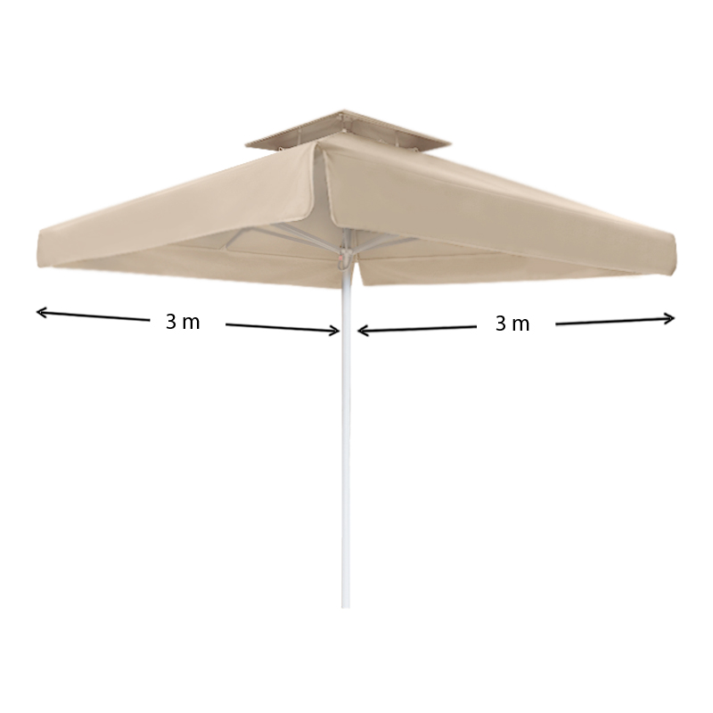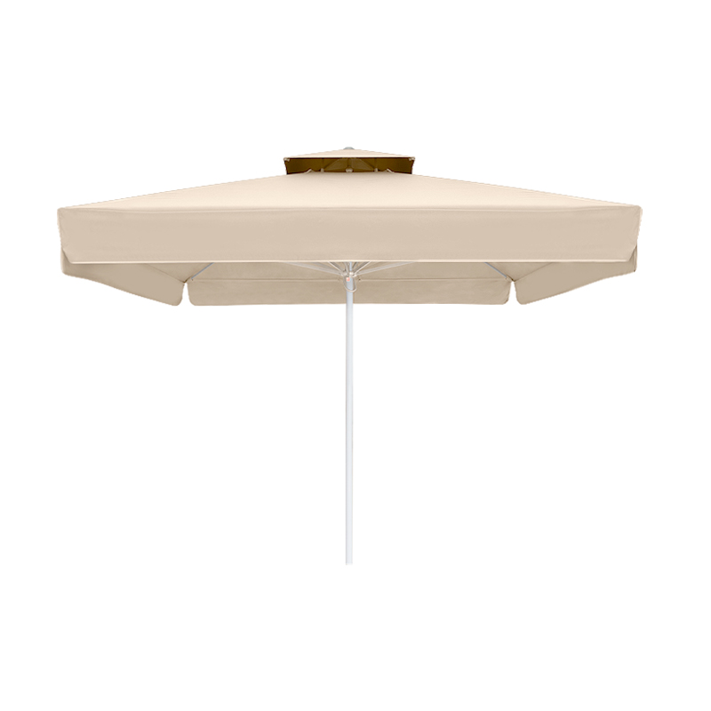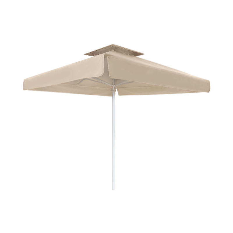 Τετράγωνη ομπρέλα αλουμινίου με τηλεσκοπικό μηχανισμό και διπλό αεραγωγό που επιτρέπει την κυκλοφορία του αέρα μειώνοντας ταυτόχρονα την πίεση του. Ιδανική επιλογή για επαγγελματική χρήση όπως beach bars, πισίνες και χώρους εστίασης.