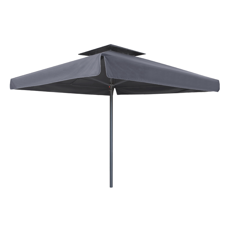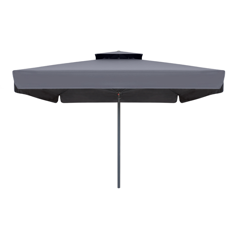 Τετράγωνη ομπρέλα αλουμινίου με τηλεσκοπικό μηχανισμό και διπλό αεραγωγό που επιτρέπει την κυκλοφορία του αέρα μειώνοντας ταυτόχρονα την πίεση του. Ιδανική επιλογή για επαγγελματική χρήση όπως beach bars, πισίνες και χώρους εστίασης.