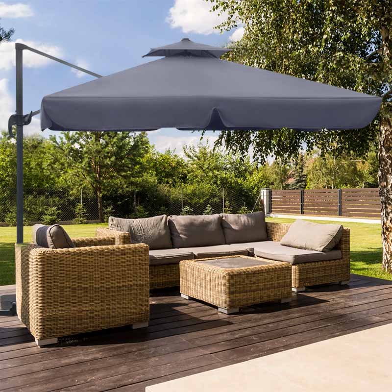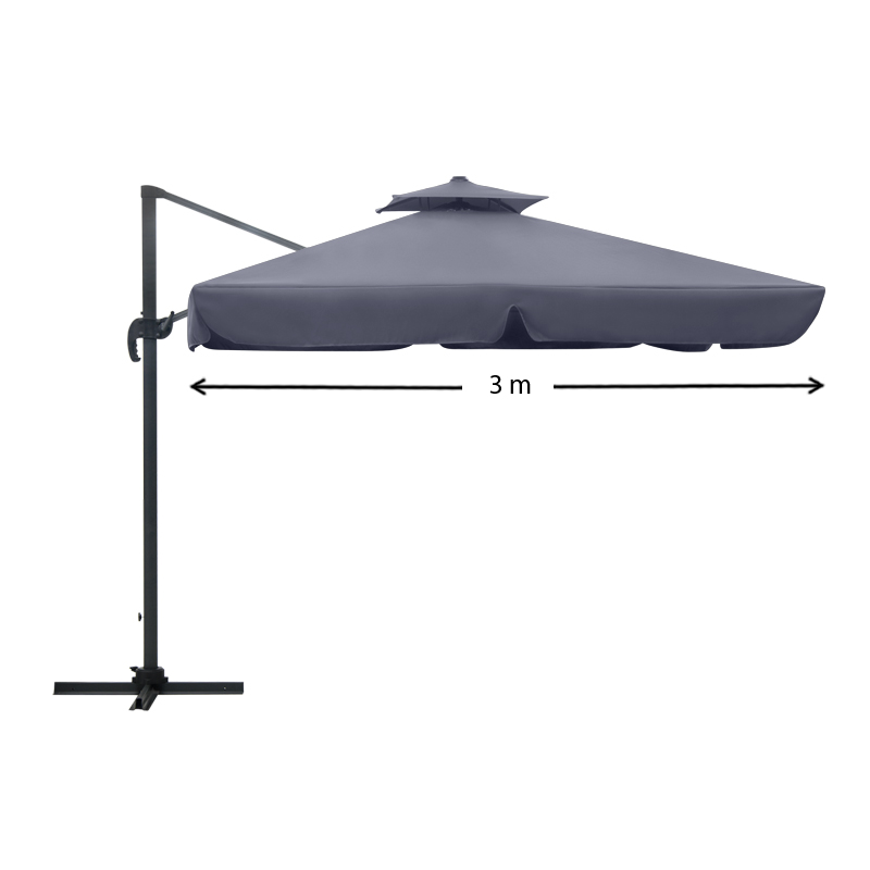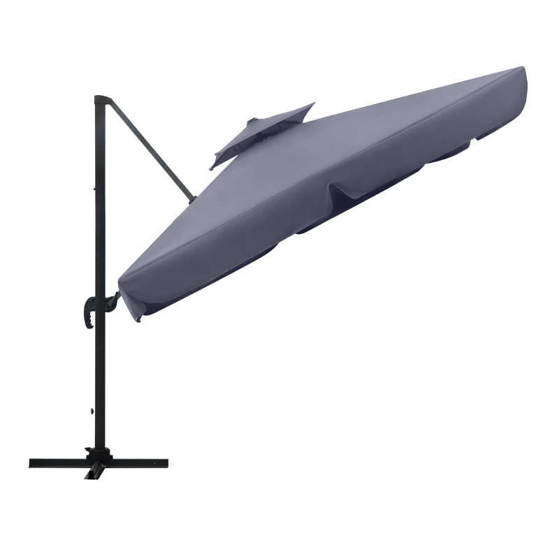 Τετράγωνη κρεμαστή ομπρέλα αλουμινίου με τηλεσκοπικό μηχανισμό και διπλό αεραγωγό που επιτρέπει την κυκλοφορία του αέρα μειώνοντας ταυτόχρονα την πίεση του. Ιδανική επιλογή για επαγγελματική χρήση όπως beach bars, πισίνες και χώρους εστίασης.