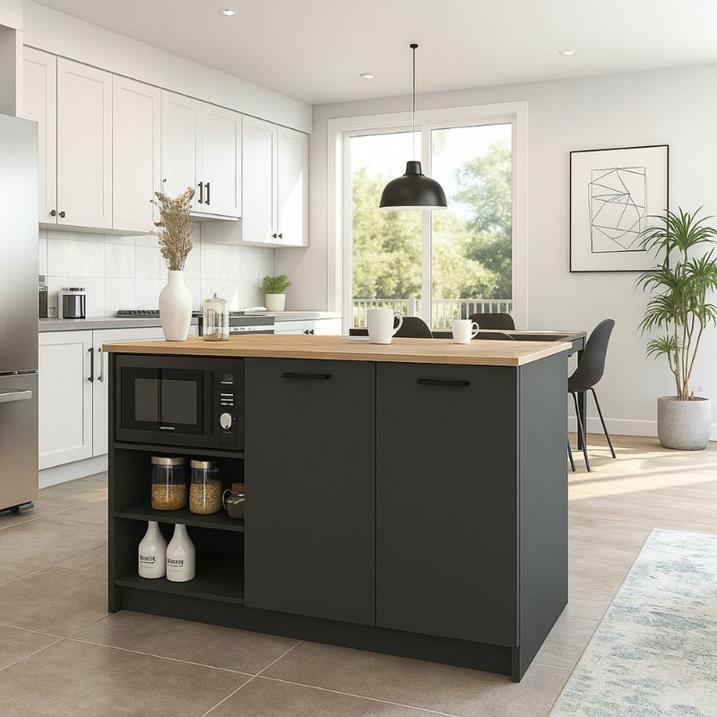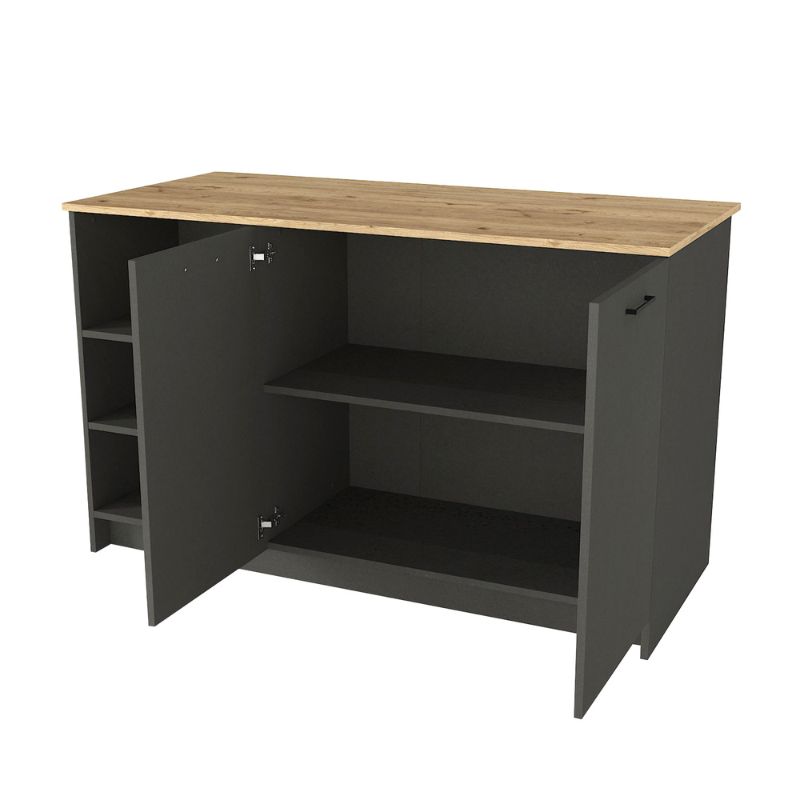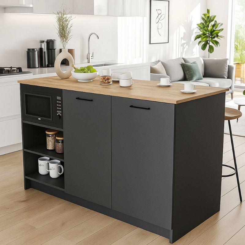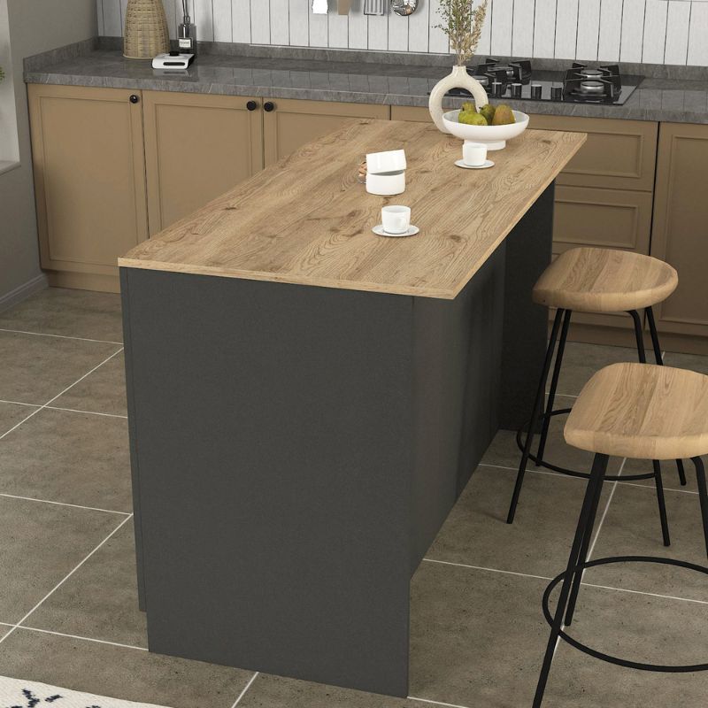 Η νησίδα κουζίνας Peres είναι η ιδανική λύση για όσους αναζητούν στυλ και πρακτικότητα στον ίδιο χώρο. Με ζεστή απόχρωση ανθρακί με φυσικό ξύλου και μινιμαλιστικό σχεδιασμό, λειτουργεί τόσο ως πάγκος προετοιμασίας όσο και ως τραπέζι για γεύματα ή χαλαρές στιγμές. Οι ενσωματωμένοι αποθηκευτικοί χώροι σάς βοηθούν να οργανώνετε εύκολα σκεύη και προμήθειες, ενώ η εργονομική της διάταξη ταιριάζει σε κάθε μοντέρνα κουζίνα.