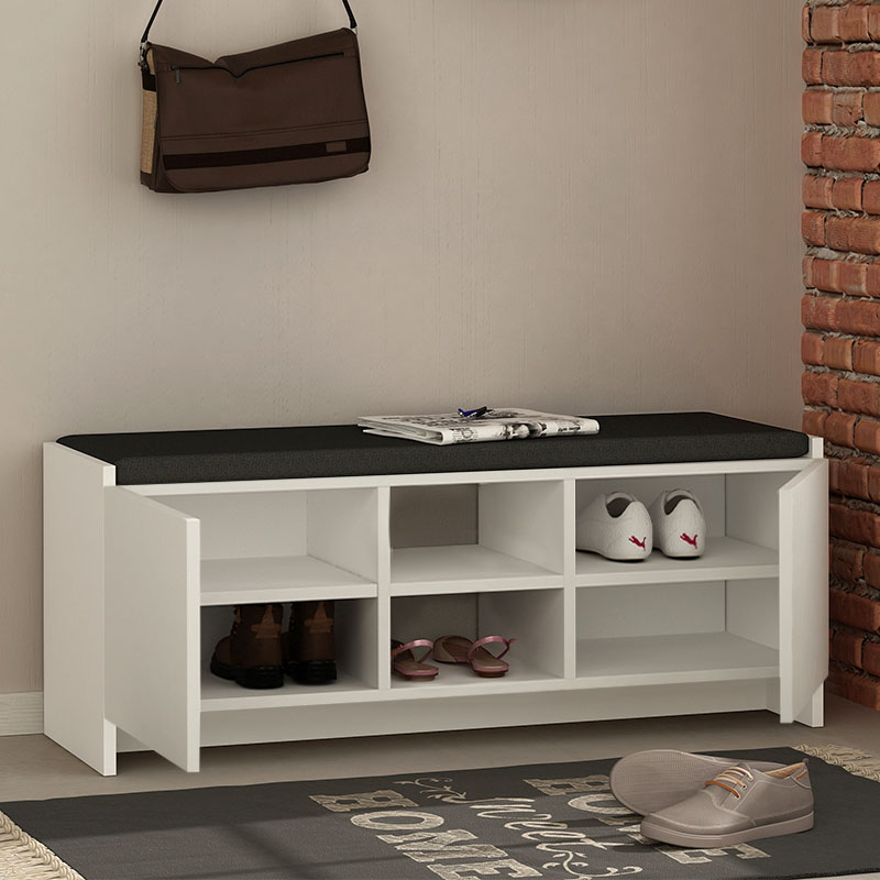 - Δεξιά κι αριστερά φέρει ντουλάπια, δύο ράφια στη μέση και κάθισμα.