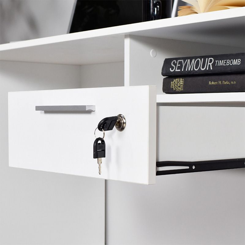 - Διαθέτει ένα συρτάρι με σύστημα κλειδώματος στα δεξιά και ένα ράφι ακριβώς πάνω από το συρτάρι.