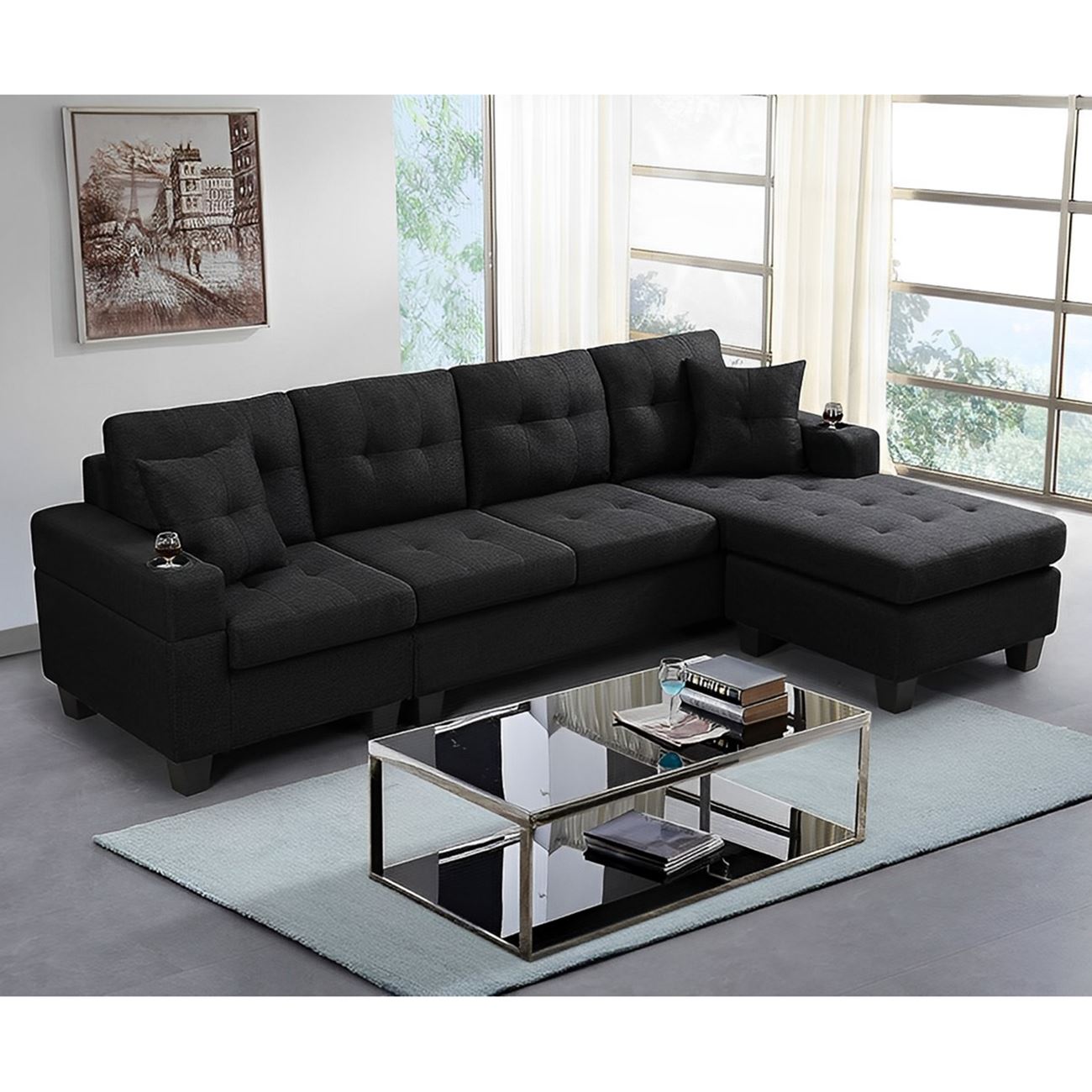JORDAN Καναπές Σαλονιού Γωνία Αναστρέψιμος, Ύφασμα Μαύρο, Μπράτσα με ποτηροθήκες