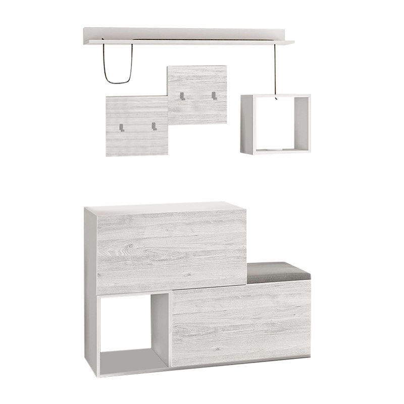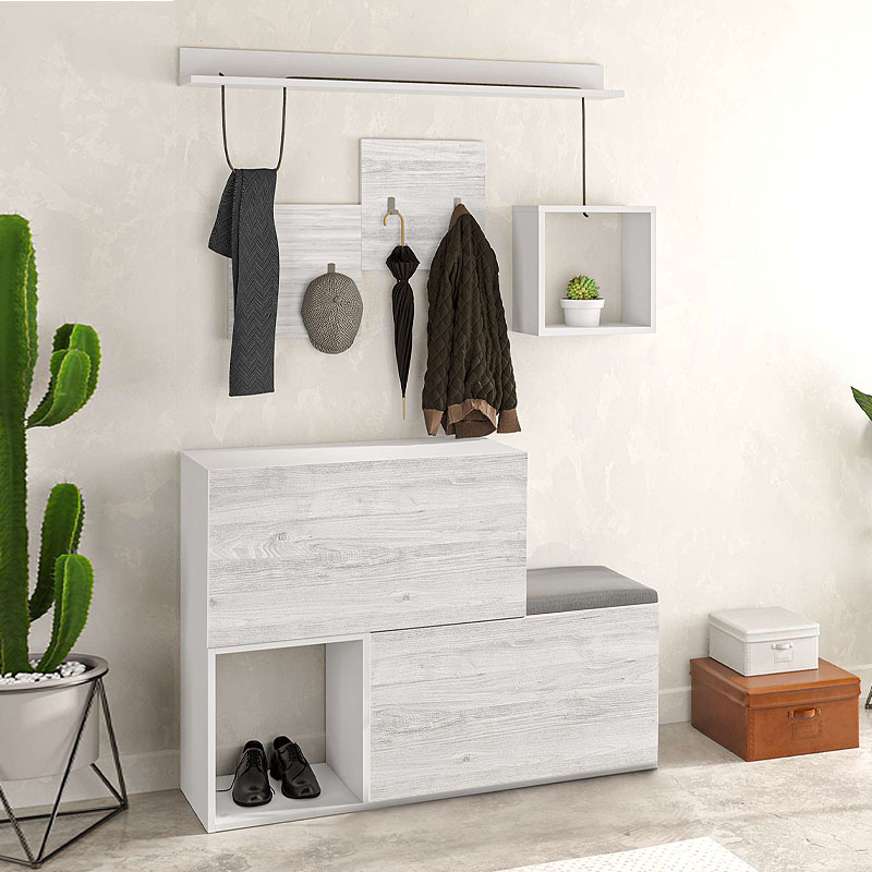 - Φέρει δύο κλειστά ντουλάπια για παπούτσια, ράφια - κουτιά για διακοσμητικά, κρεμάστρες και ένα αναπαυτικό μαξιλάρι καθίσματος σε χρώμα μαύρο.