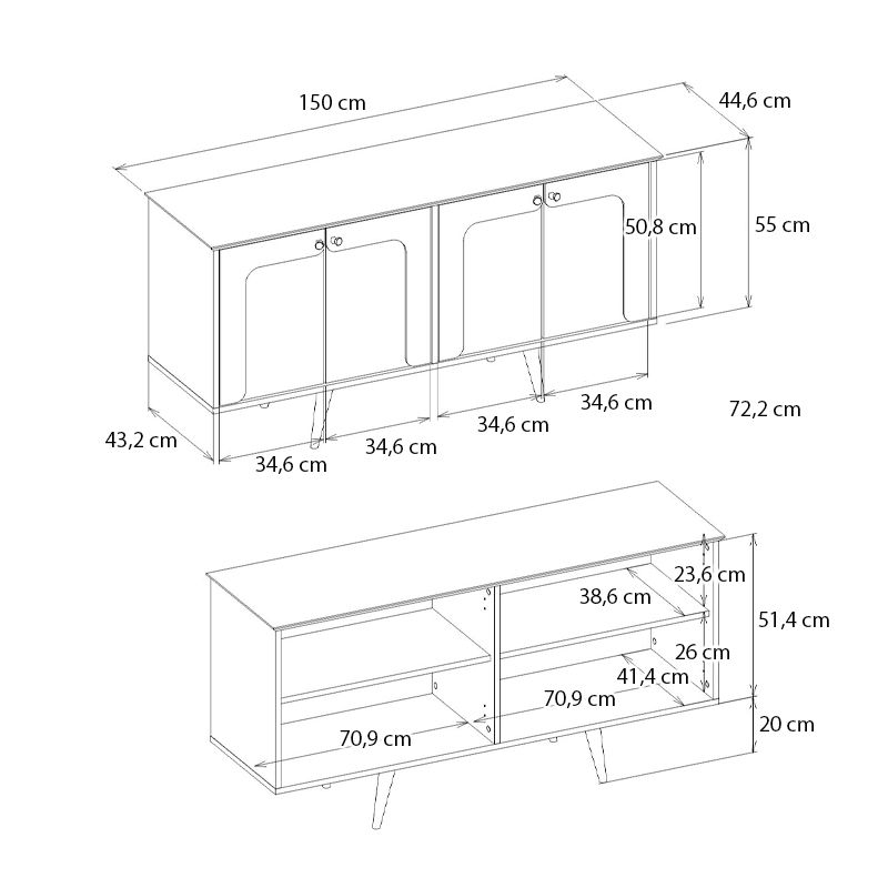 - Διαστάσεις: Μήκος 150 x Βάθος 44,6 x Ύψος 72,2 εκ.