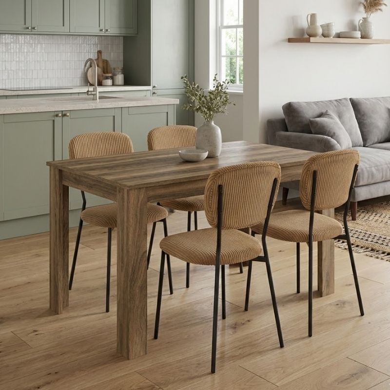 Η τραπεζαρία Darlen - Kevin θα φέρει μία αίσθηση εκλεπτυσμένης κομψότητας στον χώρο σας. Το πλούσιο κοτλέ ύφασμα της καρέκλας χαρίζει ζεστασιά και υφή, ενώ τα μαύρα μεταλλικά πόδια προσδίδουν μοντέρνο χαρακτήρα και σταθερότητα. Ιδανική επιλογή τόσο για το σπίτι όσο και για επαγγελματικούς χώρους που θέλουν να επικοινωνήσουν ποιότητα και design σε κάθε λεπτομέρεια.