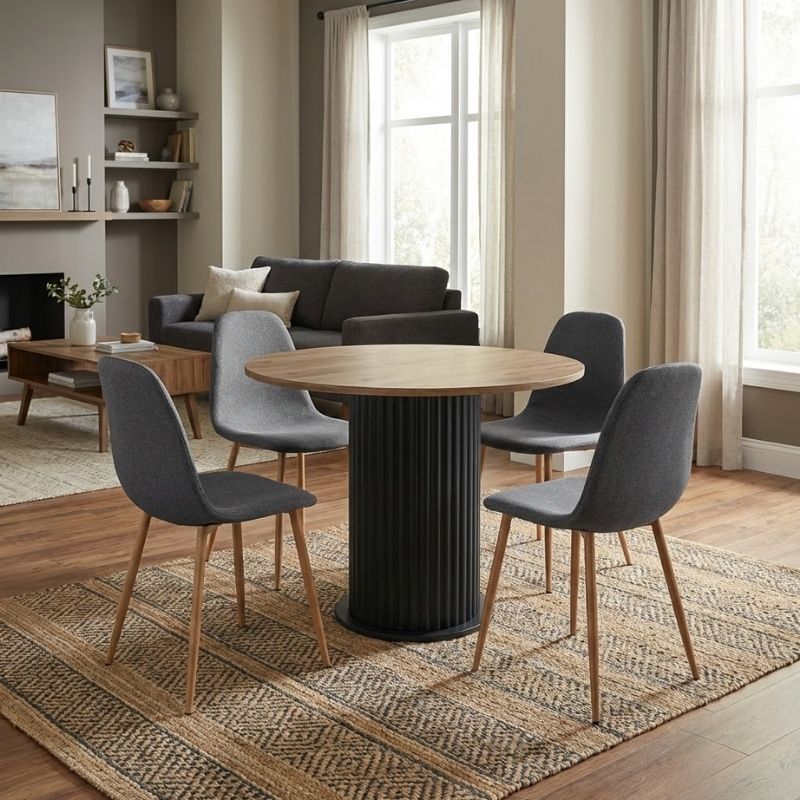 Σετ τραπεζαρία 5τμχ Bohema - Iris χρώμα μαύρο/sepet oak - γκρι/φυσικό πόδι Ø90x77,7εκ.