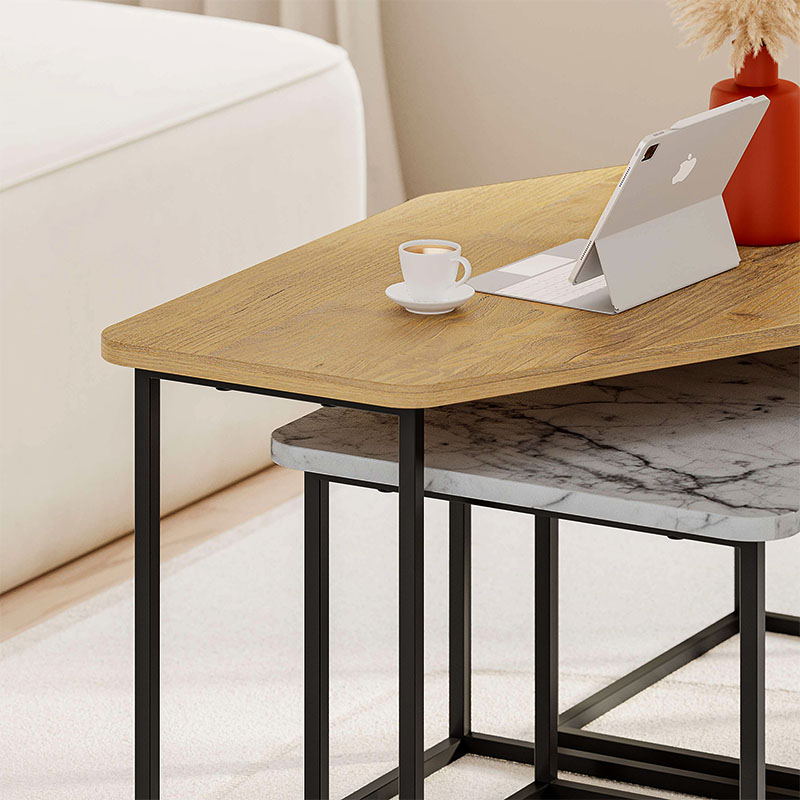 Τραπεζάκι σαλονιού σετ 3 τμχ. Nesty χρώμα saphhire oak - γκρι ρετρό - λευκό εφέ μαρμάρου 110x60x48εκ.